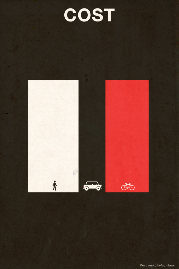 COST Nerdwallet.com has a great cost calculator for car ownership that breaks down purchase price ($372), fuel costs ($146), insurance ($98), maintenance ($99), and other miscellaneous fees ($12) on a per month basis. Put in your own data to see your car's total costs each month. Better yet, use your own data to see your BIKE'S total costs each month. - At Recovery Bike Shop we estimate the average customer spends $200 per year to commute by bicycle. - That's $500 every five years to buy a "new" bike every five years - plus $100 per year in maintenance for a moderate commuter. - That's $1000 per five years or $200 per year. - That's $16.67 per month. - The average bike commuter consumes more calories than the average car commuter. The cost of that increased food consumption is something like $1.87 per day. (source) - This means the food costs of bike commuting are $56.10 per month. - So, the costs of owning and operating a bike are something like $72.77 per month. - Of course, your health care costs will likely go down. - Given that the "fuel" required for walking is three times that of biking on a per mile basis, we might surmise that the average walk-commuter must spend $168.30 per month on additional calories. (source) - However, it is probably less than this since a person that walks instead of bikes or drives is likely to cover fewer miles per day. We've assumed that the average walk-commuter travels something like half of the distance of a bike commuter each day. - This brings the cost of walking as transportation down to about $85 per month. Actually pretty comparable to bike-commuting. Of course this says nothing about the costs of kicks. These are the numbers reflected in the poster above. What the cost numbers don't show is that the average American drives 876 miles in a month. The average bike commuter comes no where near this. And walkers travel even less. So it is also helpful to look at these numbers on a per mile basis. - The average gasoline powered car costs about $0.83 per mile (including gas, purchase price, insurance, etc.). - The 2014 census says that the average bike commute is 19.3 minutes. (source) - The average rider travels 11 miles per hour. (source) - So the average commute is about 3.5 miles. - Twice a day is 7 miles. - Assume 5 days a week and 251 work days per year and we get 148 miles per month. - Add another 102 miles (educated guess) for errands and riding to see friends and family and probably the average bike commuter puts on something like 250 miles per month. - That's about $0.30 per bike mile. Again, most of that is in additional food consumption. Please note: not all sources come up with exactly the same numbers, so we have tried to be conservative when choosing data points. Also we have made some minor tweaks when appropriate based on our own experience and our knowledge of our customers at Recovery Bike Shop (like the price of buying a bike every 5 years). Having said that, almost all of the research agrees: driving a low occupancy vehicle is many times more expensive than riding a bike. |