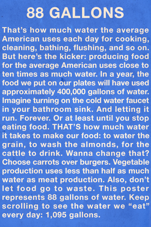 88 GALLONS PER DAY - Americans use a shocking 88 gallons of water per day just from the faucets and toilets in our homes and workplaces. Australians weigh in at a whopping 82 gallons per day. (source) - But the water we see in our sinks and bathtubs is nothing compared to the water that goes into producing the food we eat: 1,095 gallons per day. That's a gallon and a half of water every two minutes. (source) - The good news is that a little bit of effort makes a big impact. For example, switch to meatless chili and save more than a hundred gallons of water. (source) |